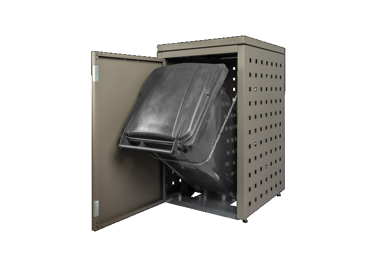 Deze kliko-ombouw met vaste deksel opent aan de voorzijde. Door het kantelsysteem komt de container schuin naar voren en wordt deze opgevangen door een transversale ketting, zodat de deksel van de kliko eenvoudig geopend kan worden.