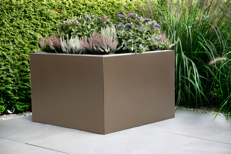 De bruine vlakke plantenbak is ontworpen om natuurlijke materialen en kleuren samen te brengen. De coating in chocoladebruine staal brengt harmonie tussen hout, beplanting en bestrating, terwijl de gladde panelen zorgen voor een rustige, hedendaagse vorm.